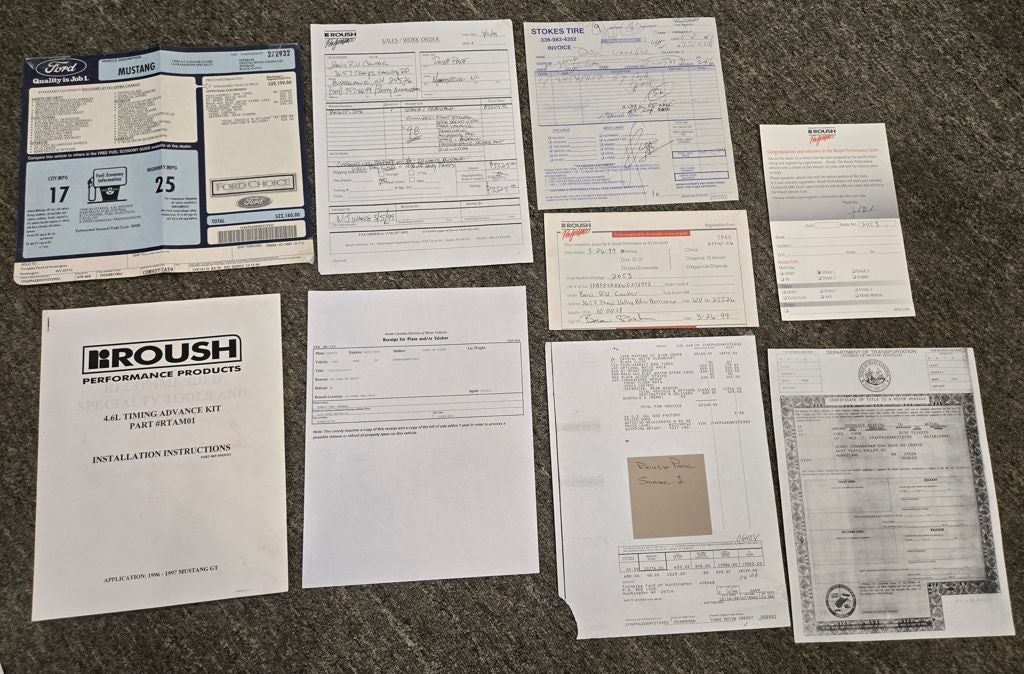 Fully documented with only 641 actual miles. Fully serviced and ready for the next collector. This was sold new in North Carolina where it remained and now is offered for the first time to the public. Finished in immaculate Crystal White over charcoal cloth print, this car still smells and presents as new. All receipts and documents since day one, including window sticker, Roush paperwork and installation instructions and receipts, owners manuals and safety books. Two keys with on fob. This car presents as new in every way. Side exit exhaust, beautifully detailed engine compartment, tires replaced in 2004 as part of regular service. Recent service here at our dealership including fresh fuel and fuel system flush, oil change and overall inspection. This car is ready for its next care taker. Buy only the best. Take a close look at nearly 100 detailed photos and judge why this should be the next car in your collection.