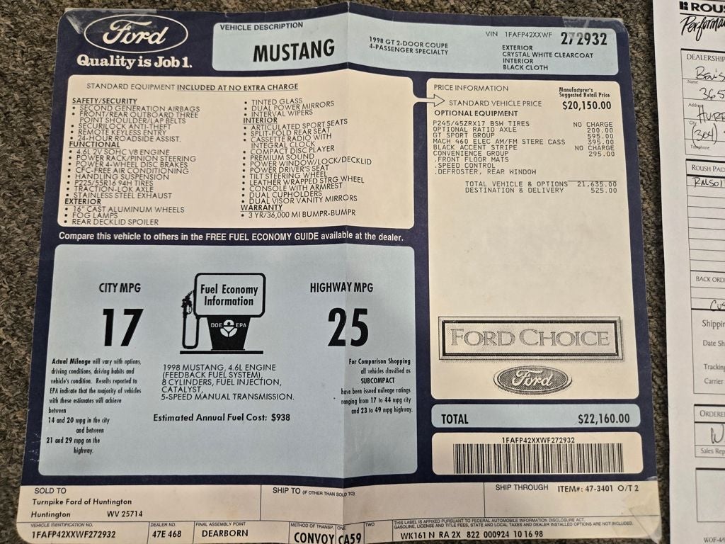 Give us a call today to make this car the 1st of your collection or add it to your to your existing collection. We ship world wide door step to doorstep delivery, we finance, we own all of our classics. Buy with confidence from a trusted dealership no consignments here. WE encourage 3rd party inspections. Call today 843 399 2279 Autoworld Classics and Specialties 850 East US Hwy 501 Conway SC 29526. 1998 Ford Mustang GT Roush RWD 5-Speed Manual 4.6L V8 SMPI 16V